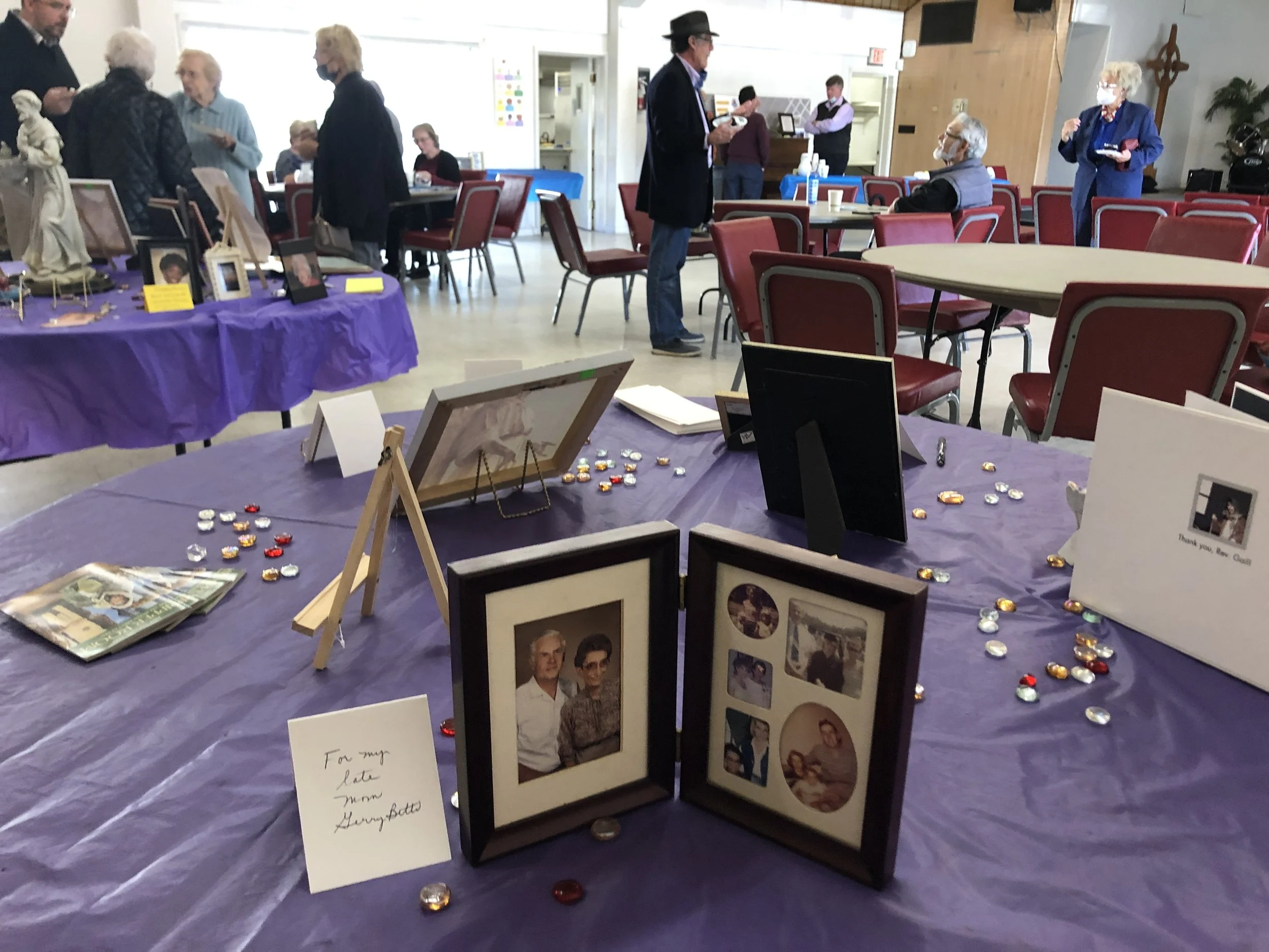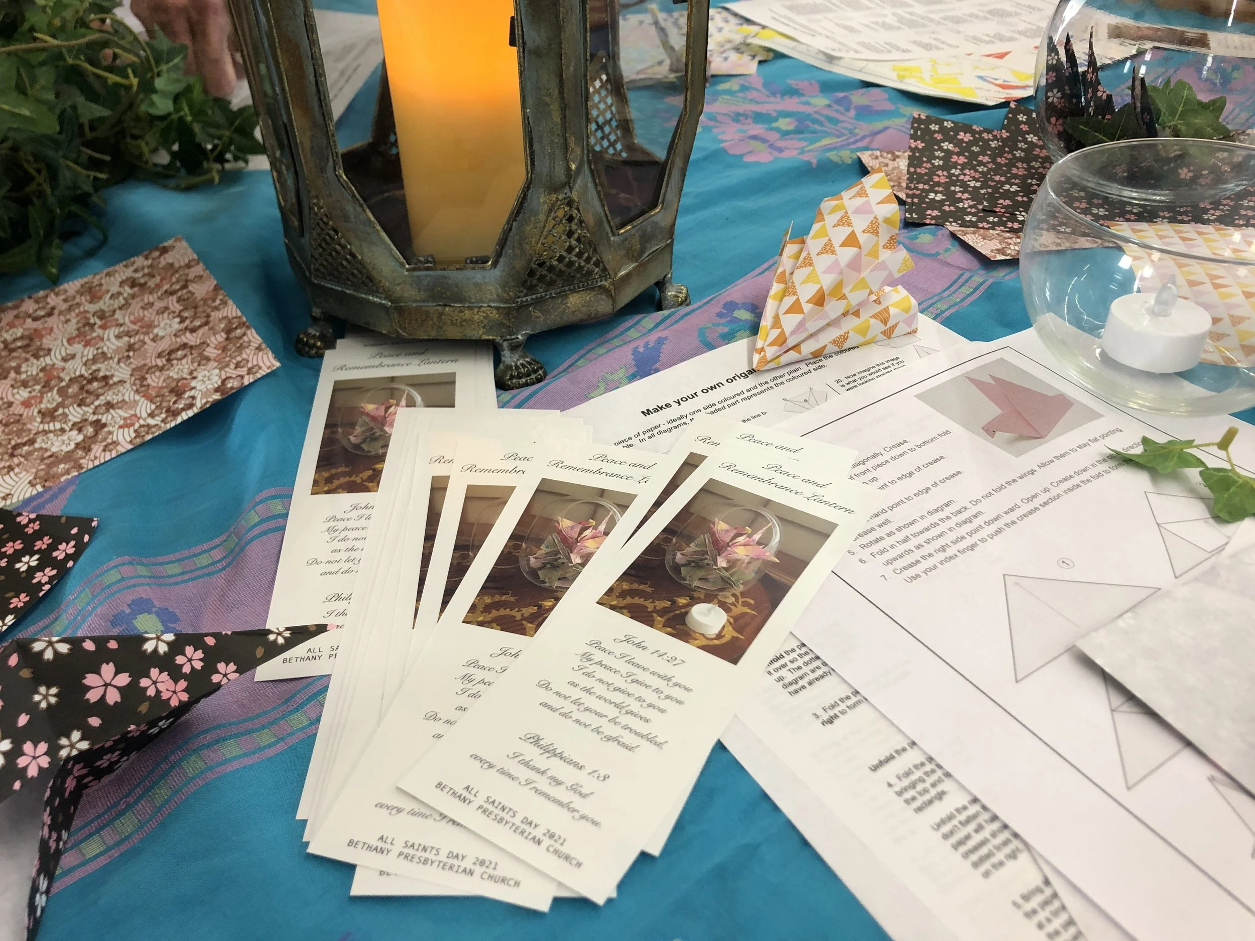 Bethany observed All Saints Day at its November 7, 2021, worship service. Names of deceased loved ones—submitted by church members and friends—were read aloud accompanied by the chiming of a bell. Participants were invited to come forward to light candles in memory of those “saints” who have gone before. Following the service, Rev. Janice Kamikawa led the folding of origami cranes and crafting of “peace and remembrance lanterns” for people to take home. Displays of photos and memorabilia were presented by Bethany family and friends in the Social Hall on special memorial tables—including a special “St. Francis table” for deceased pets.