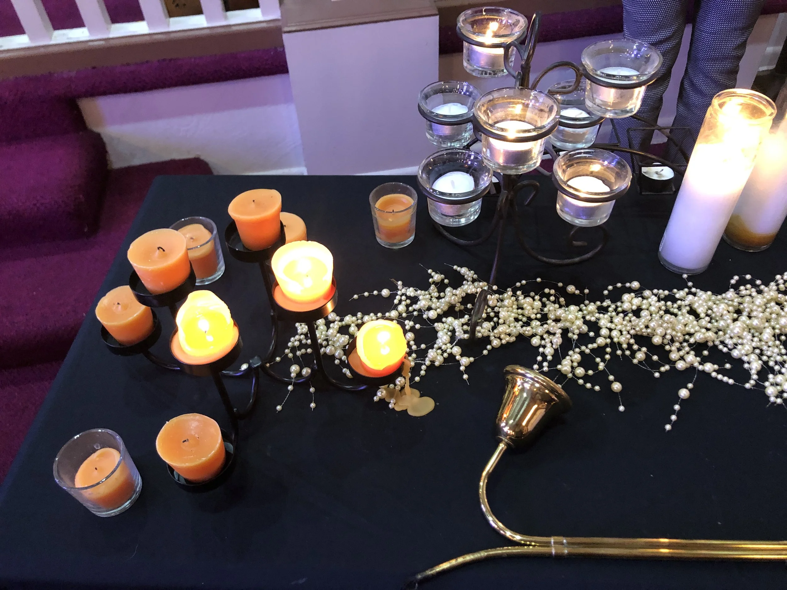 Pastor Jesse Larson chose several basic items for the worship table on All Saints Day 2021, each symbolic of our heritage as Christians. Displayed are a bible, a cross, a baptismal font with water, a chalice, cup and bread. The tabletop candle is surrounded by a pearly crown of thorns, On an adjacent table are candles of various sizes and colors—surrounded by angels and pearls—for attendees to light in memory of a deceased loved one.