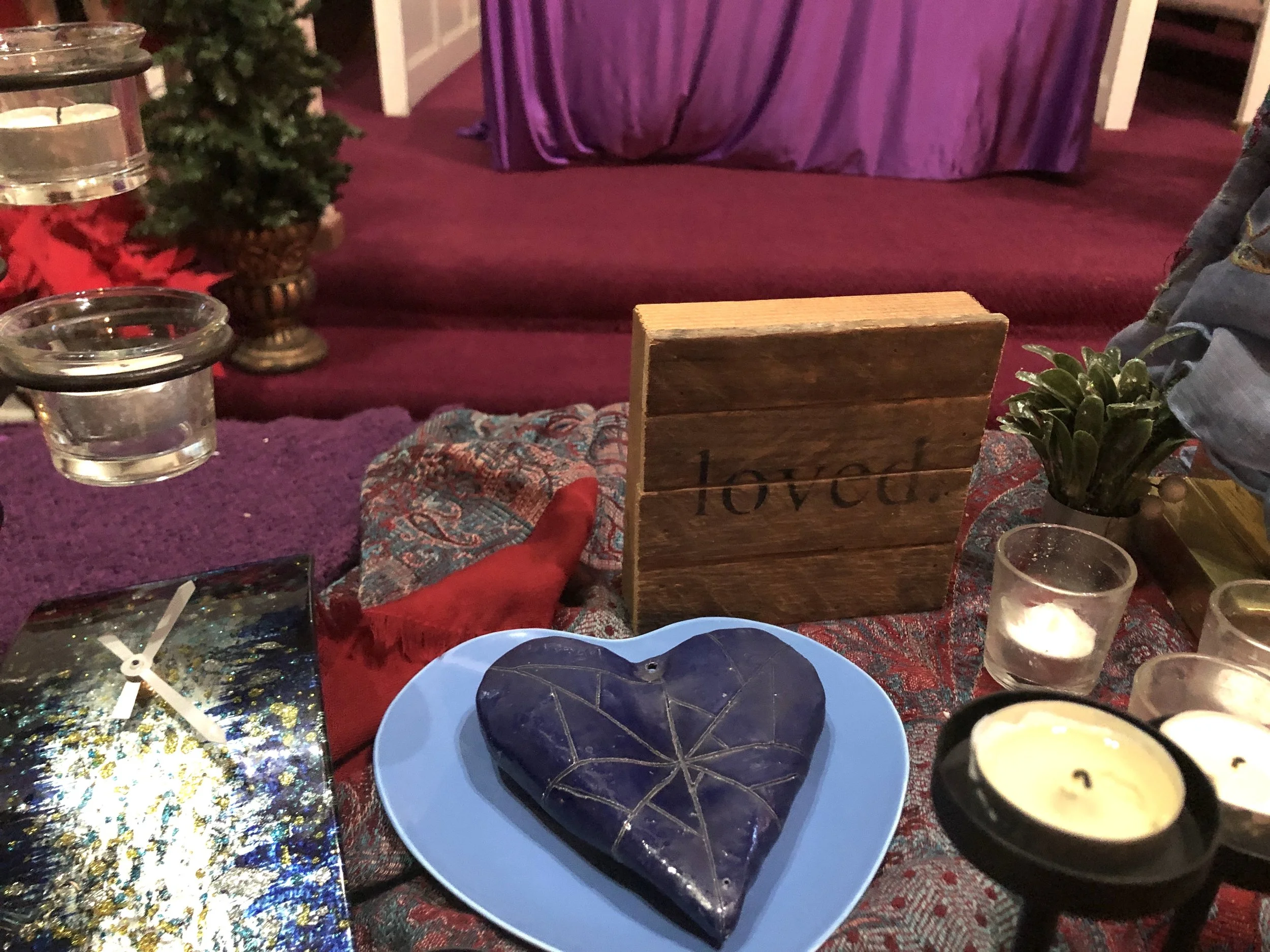 Worship table decorations for Bethany’s December 8, 2021 “Blue Christmas” service centered on themes of love and remembrance. Candles were available for participants to light in honor or memory of loved ones. An unfinished painting—left uncompleted by the late Rev. Gail Cullerton due to her death—was featured alongside a child’s toy … a reminder of the spirit of childhood that lives within us still. Juniper—a symbol of hope and faith—is displayed. Also included is a clock, which reminds of the passing of time and how every moment is precious. Hearts—which evoke the feelings of love we have for those no longer in our lives—are on display. Finally, cloth in the color blue—traditionally associated with Mary, mother of Jesus—is seen; one is draped over the cross in a tribute to Mary, whose infant child would one day turn the world upside-down.