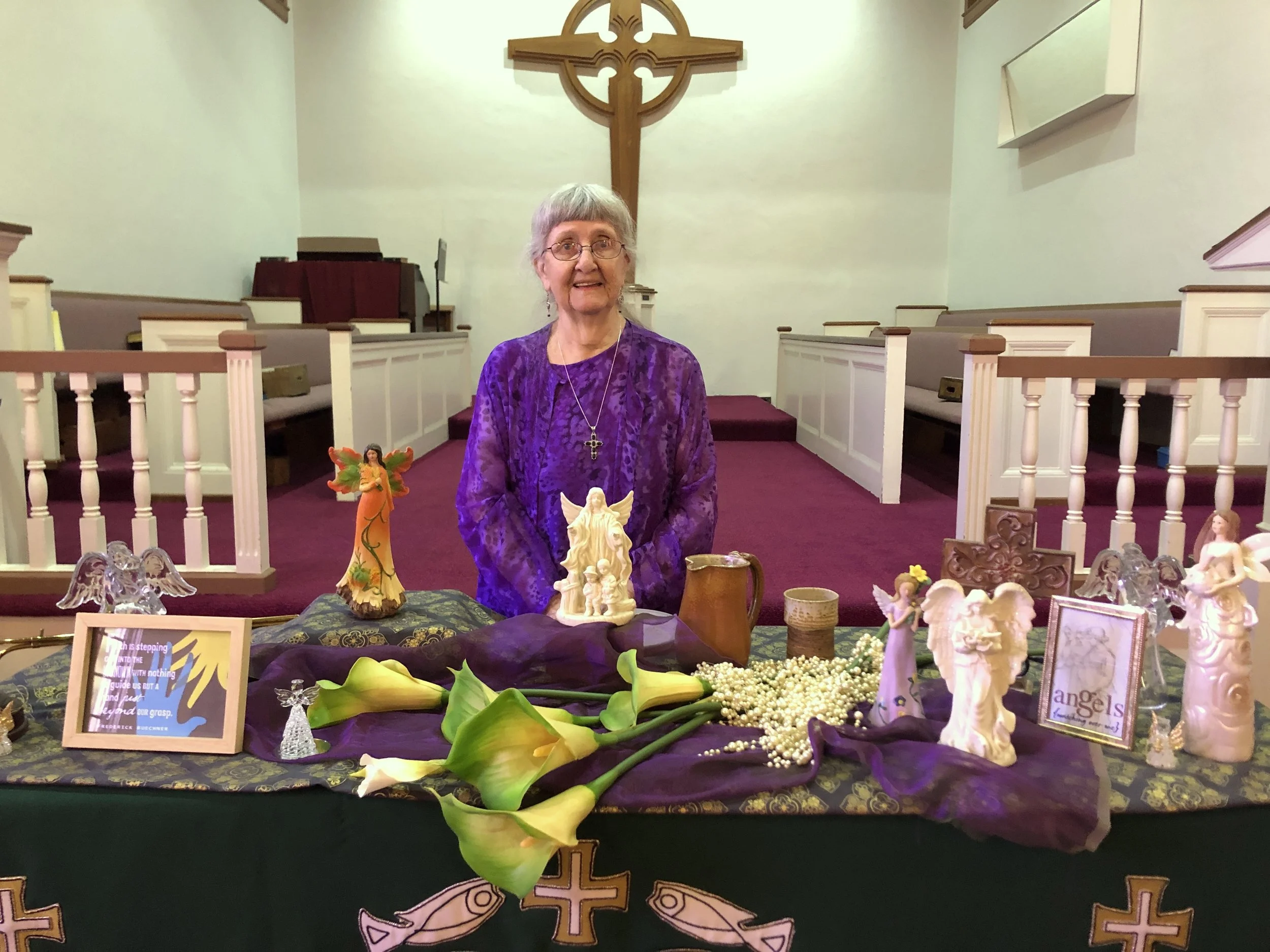 Mary and her collection of angels, which were displayed at the September 5, 2021 worship service. Click here to see all of the pictures.