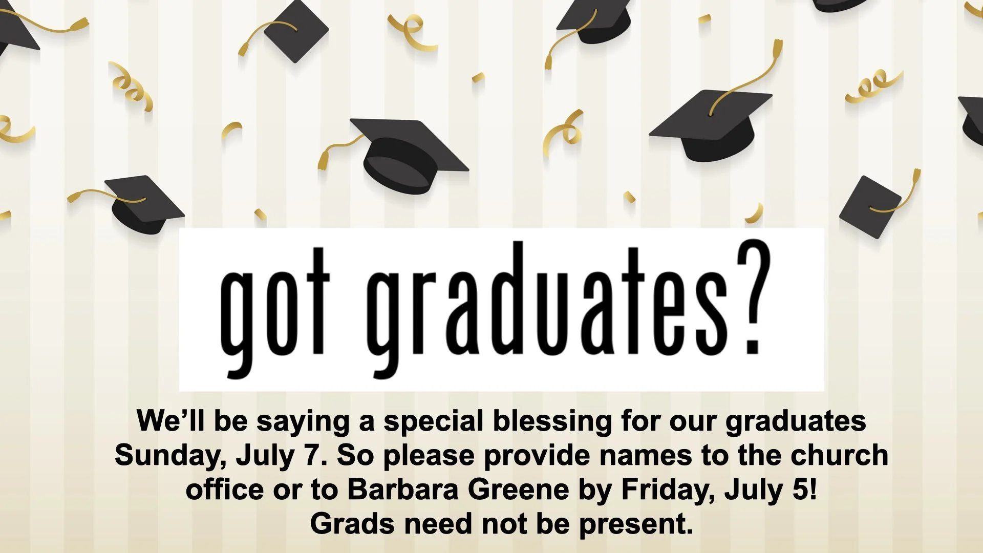 A special blessing will be said for graduates on Sunday, July 7. Please get names of your grads to the church office or to the Bethany prayer chain by Friday, July 5. Whether it's a graduation from preschool, high school, certification program, college, whatever ... we want to recognize your special loved ones at the July 7 worship service. Graduates need not be present.
