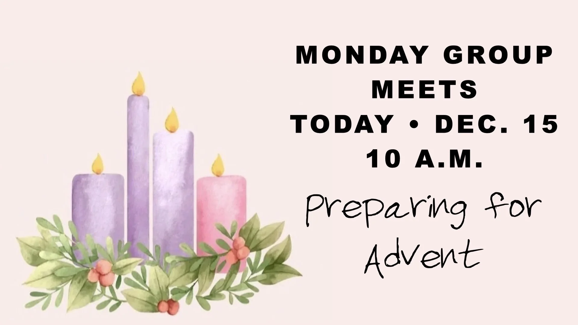 TODAY—Monday, Dec. 15—The Monday Group meets with another opportunity to further discover what the season of Advent is all about! Come to the church library at 10 a.m.
