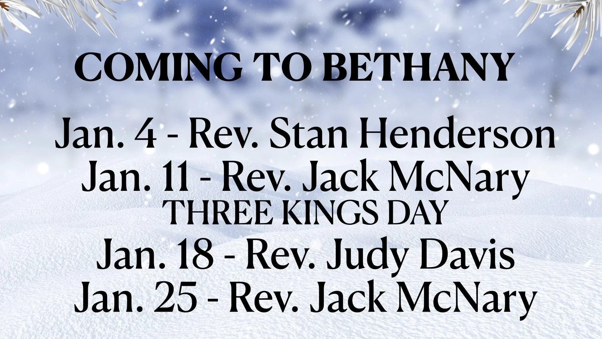 Sunday, January 11, will be celebrated as Three Kings Day (Epiphany)—the day the three wise men visited the infant Jesus. Rev. Jack McNary will preach today.