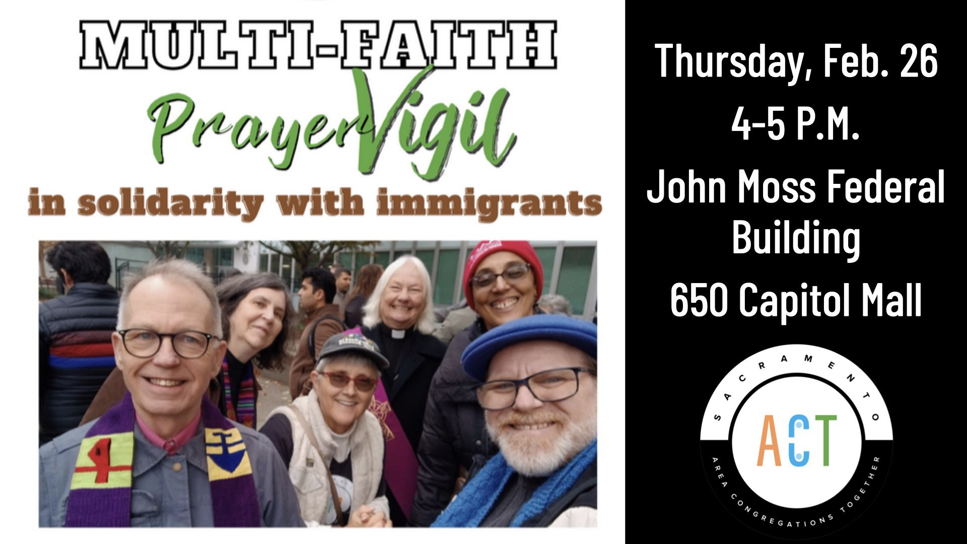 THIS COMING THURSDAY, Feb. 26—Show your love for all of God's children by attending the next multi-faith prayer vigil held downtown at the John Moss Federal Building, 650 Capitol Mall.This is another in a series of ongoing events presented by Sacramento Area Congregations Together. It’s happening 5-6 p.m. Click here for more details.