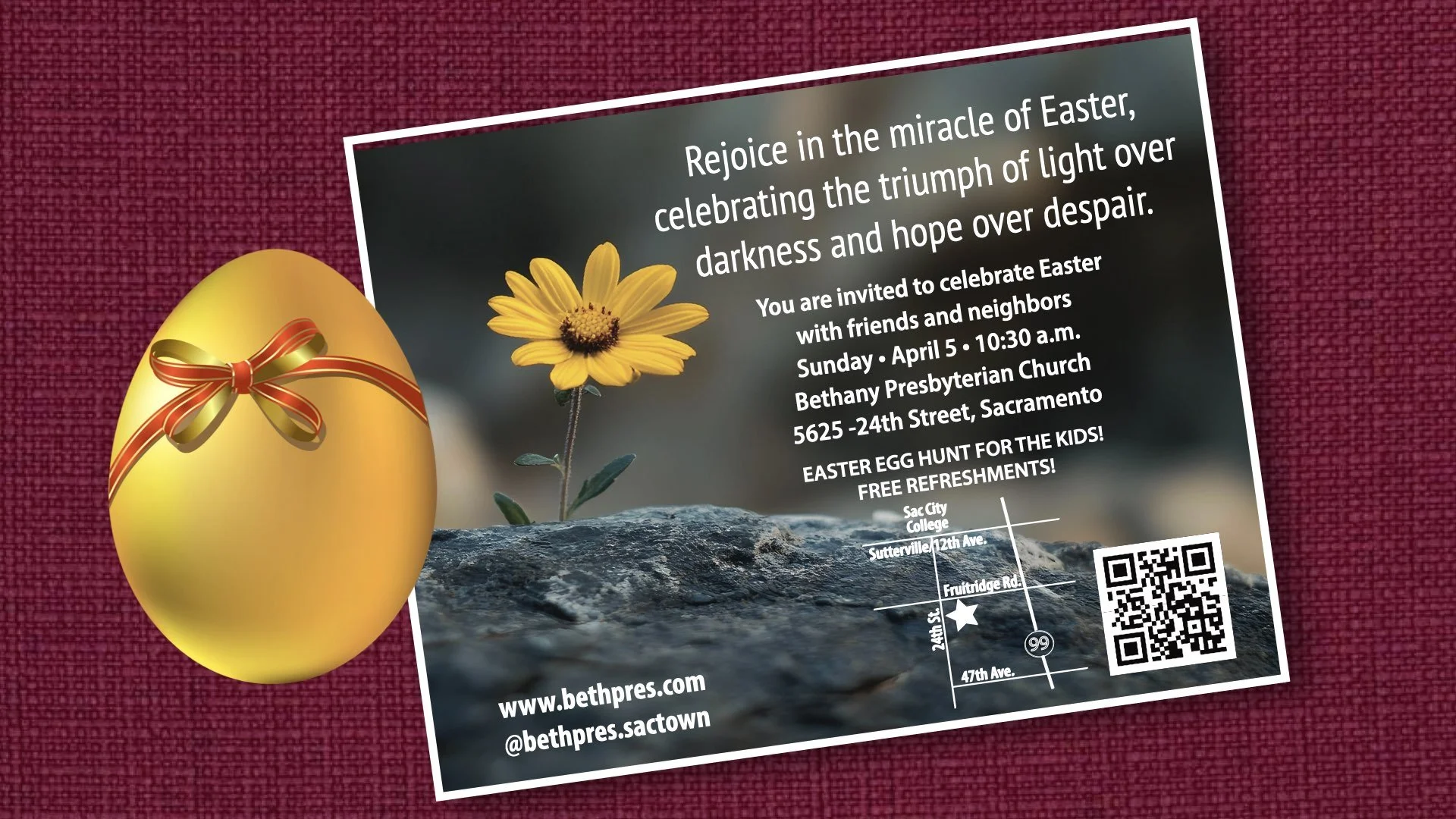 Sunday, April 5—Easter Sunday service, 10:30 a.m. Elder Jim Guida will be preaching today.