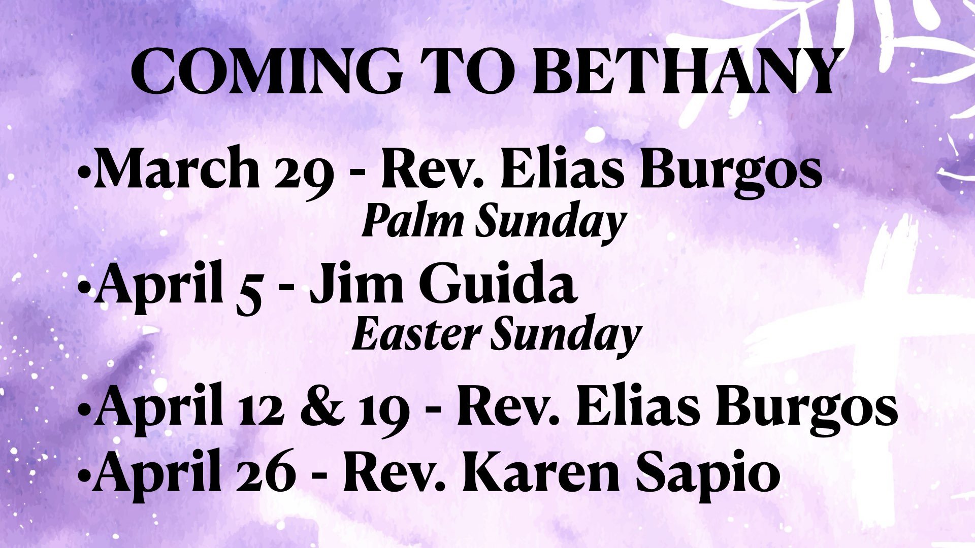 Sunday, March 29—Palm Sunday worship service; starts 10:30 a.m. Rev. Elias Burgos will preach.