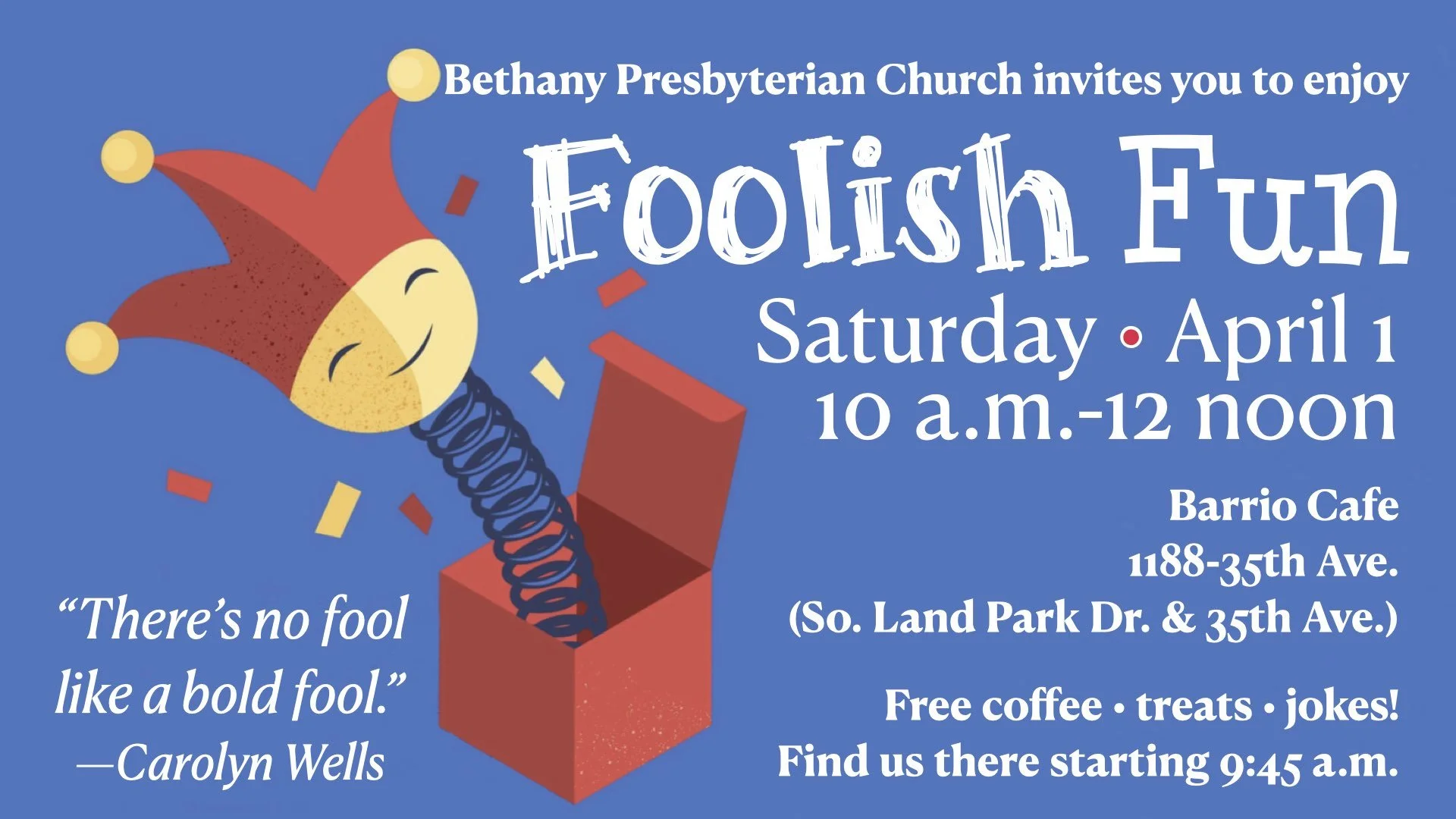Gather between 10 a.m.-12 noon on Saturday, April 1, at Barrio Cafe, 1188-35th Ave (two blocks south of Belle Cooledge Library) for coffee, delicious snacks and joke-filled conversation! Find out about the charming April Fool Fish tradition of France and share a funny story or two. Bring friends!