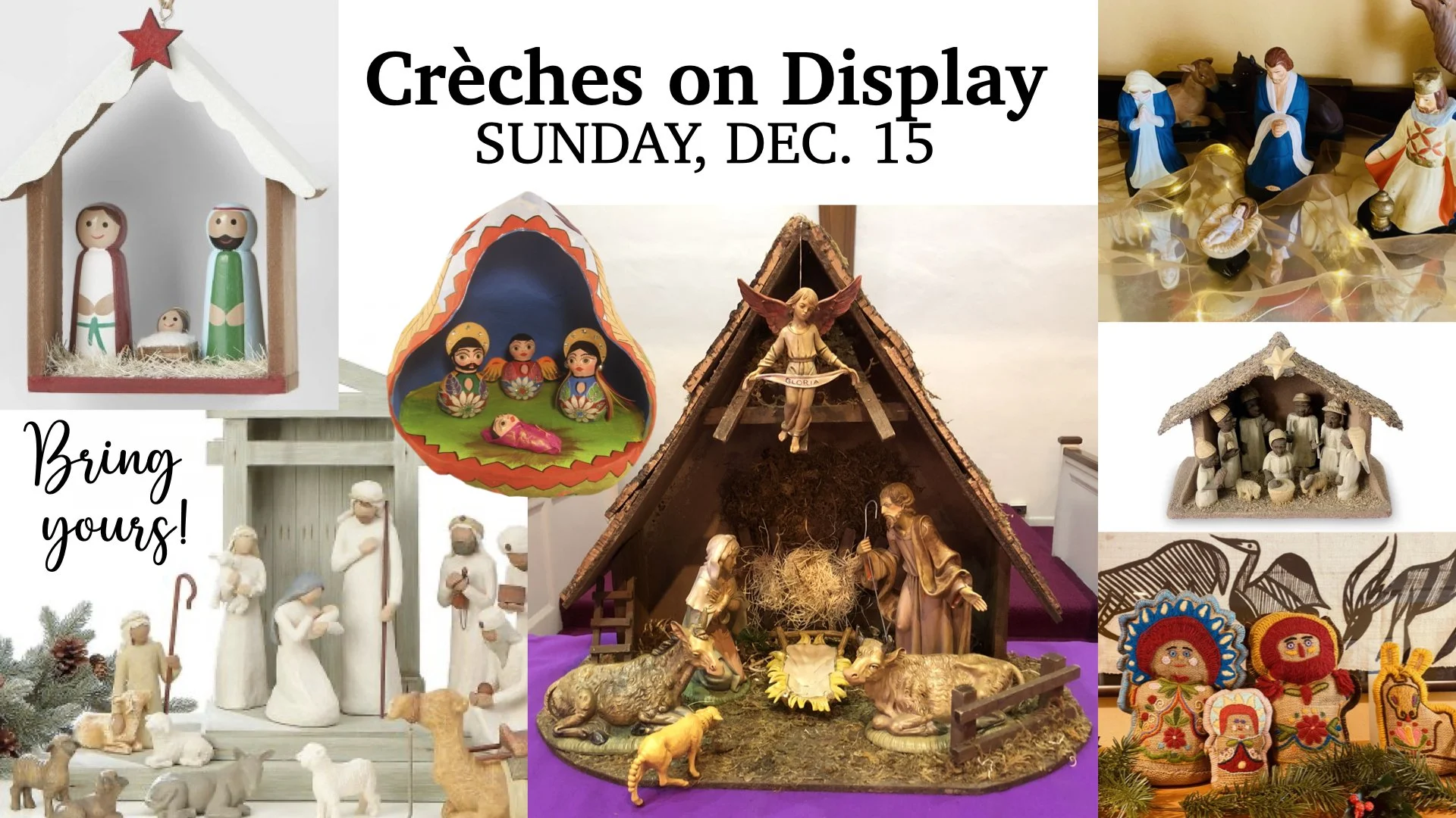 Your manger scene should be brought to the sanctuary by 10:20 a.m. on December 15. Everyone will take home their créches at the end of the worship service.