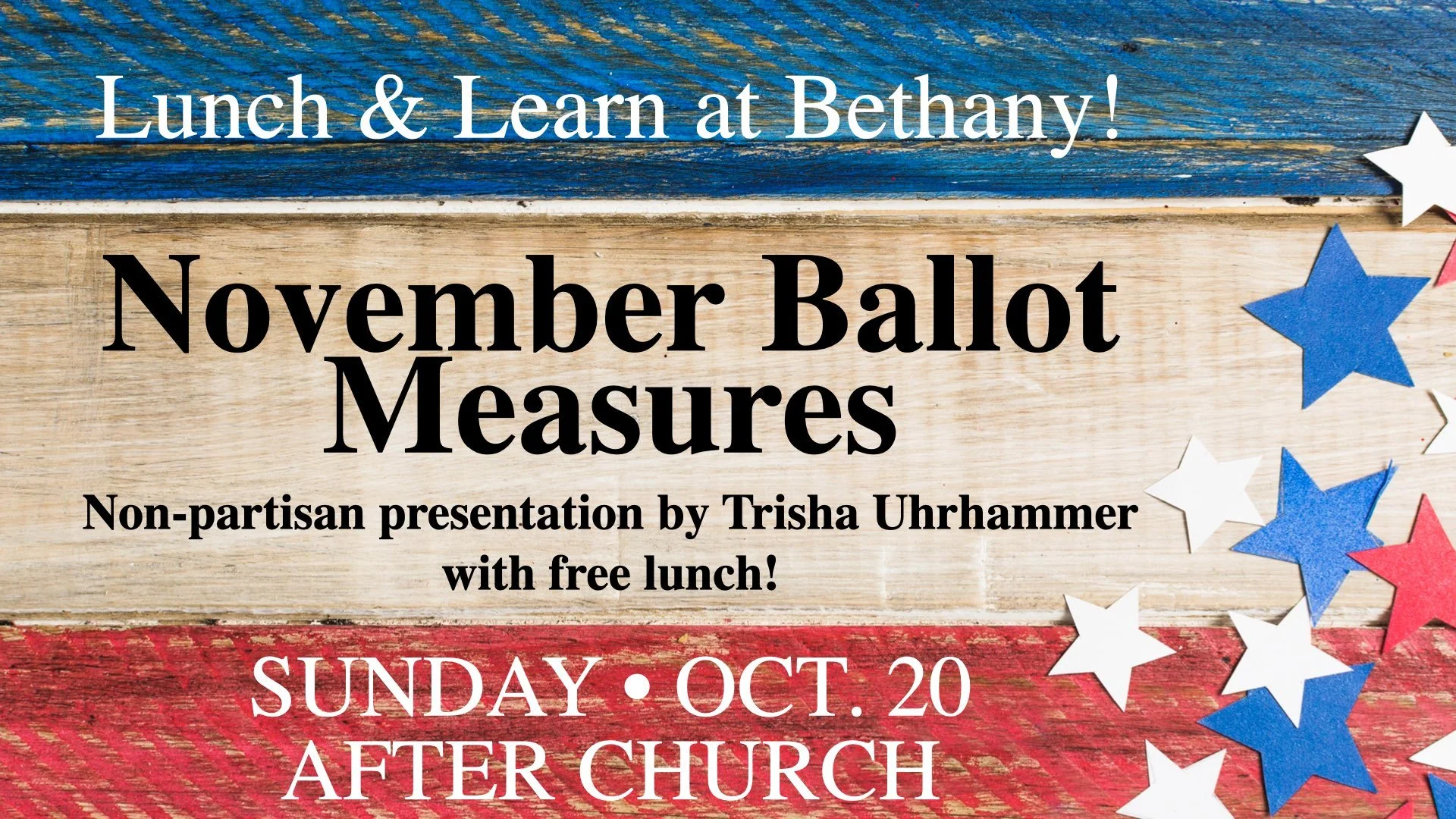 Enjoy lunch with Bethany friends and learn about the “pros and cons” of ballot measures for the November 5th election! Longtime League of Women Voters member Trisha Uhrhammer will lead an unbiased and non-partisan presentation of the the ballot measures as you enjoy a delicious lunch, provided by Bethany and organized by Kathy Frank and her volunteer crew LWV Easy Voter Guides will be available. All are welcome.