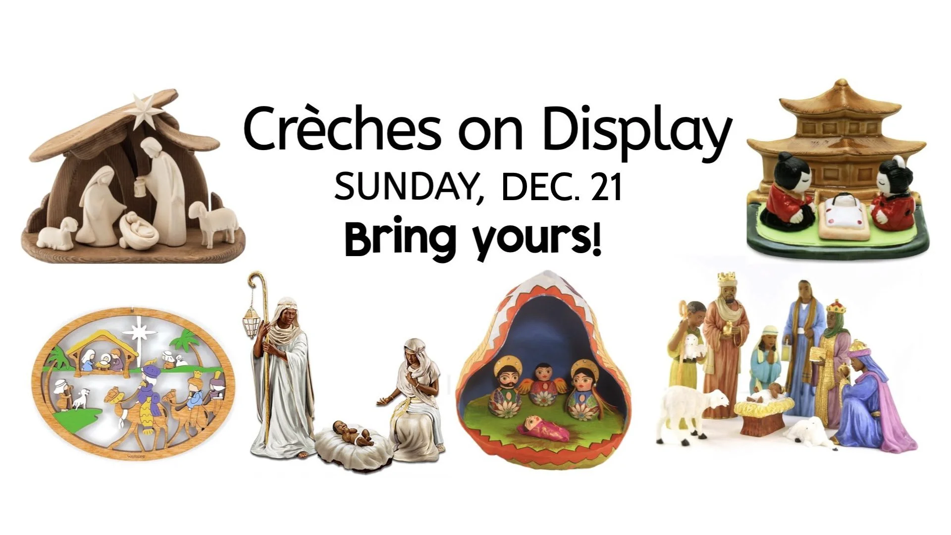 Your manger scene should be brought to the sanctuary by 10:20 a.m. on December 21. Everyone will take home their créches at the end of the worship service.