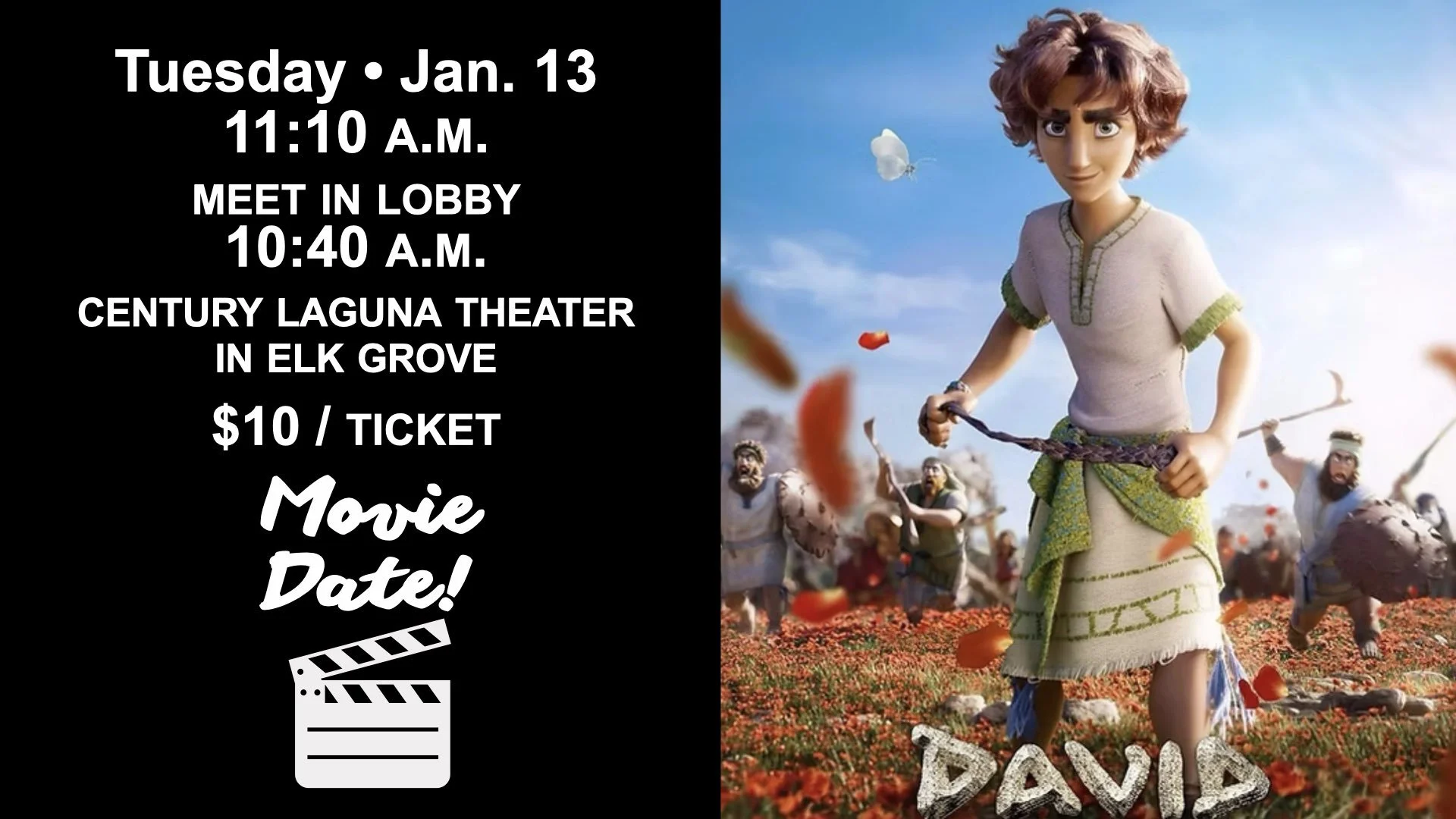 This popular animated film—which tells the tale of Bible hero King David—starts at 11:10 a.m. at the Cinemark Century Laguna Theater, 9349 Big Horn Blvd., Elk Grove. Click here for the location. Meet in the lobby at 10:40 a.m. Tickets are $7.50.