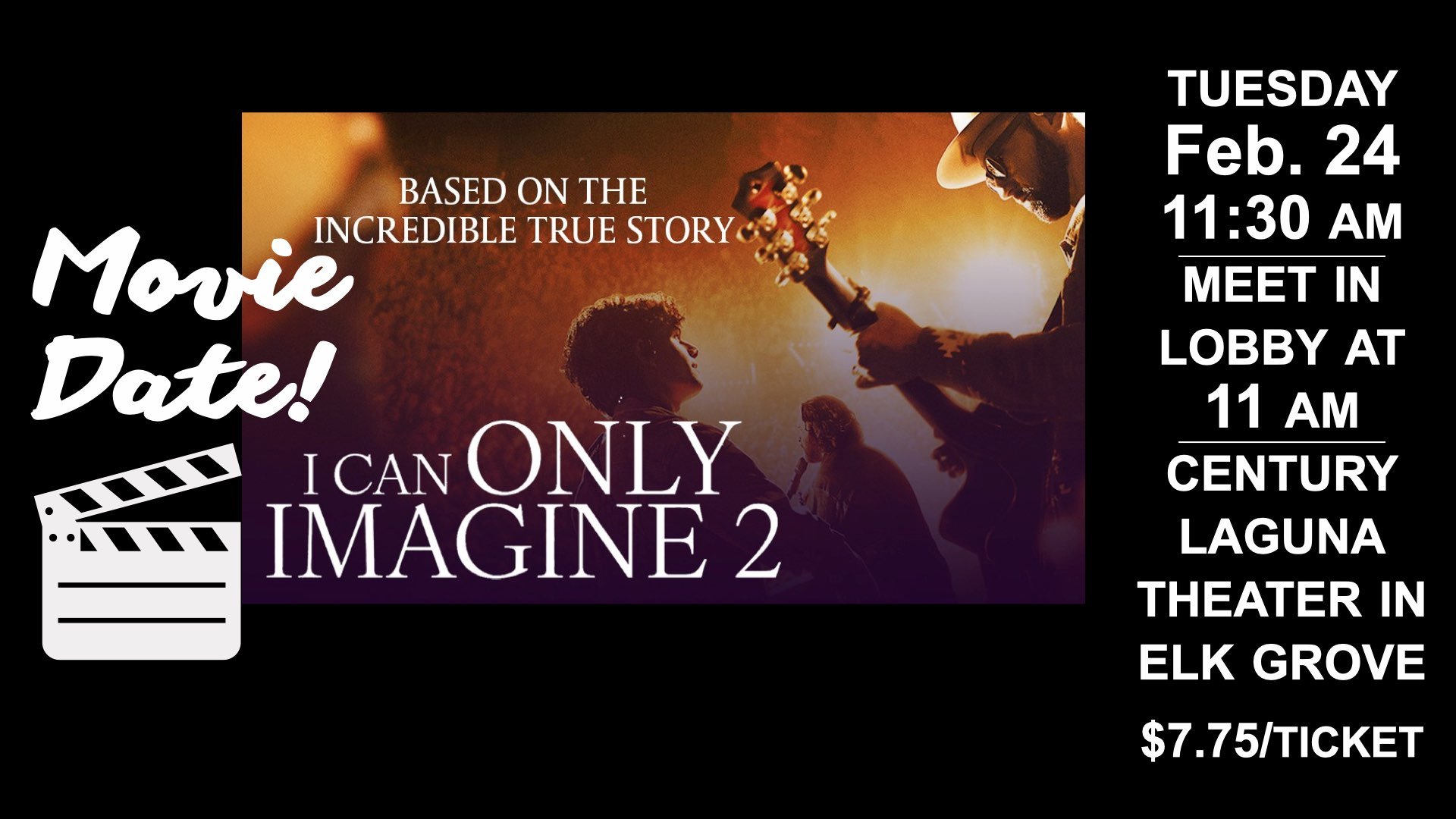 The film starts at 11:30 a.m. at the Cinemark Century Laguna Theater, 9349 Big Horn Blvd., Elk Grove. Click here for the location. Meet in the lobby at 11 a.m. Tickets are $7.75. Anyone and everyone can participate in movie outings, which take place 3-4 times a month.