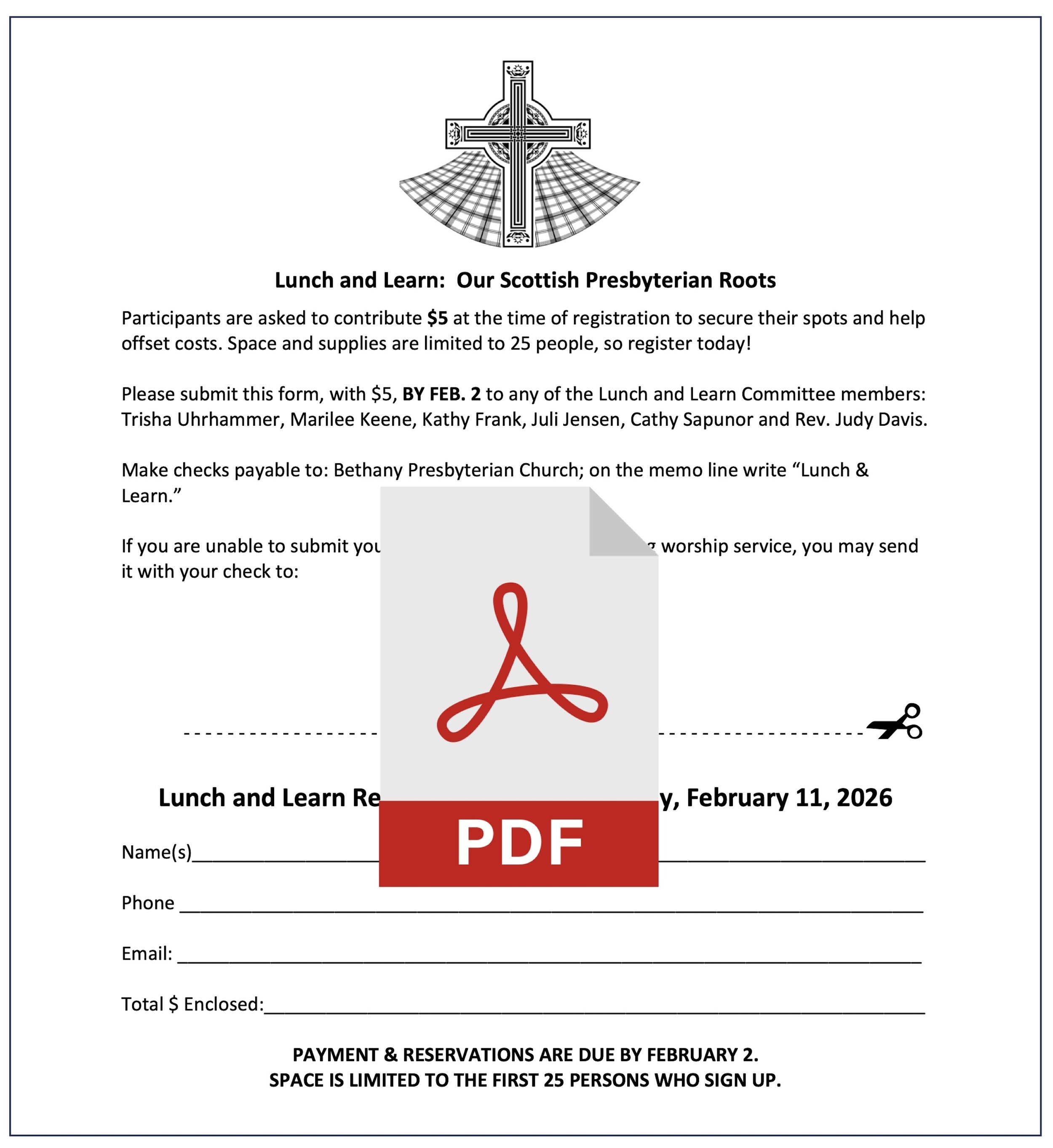 Join us for a morning in our own Social Hall “Scottish Highlands” as we explore our Presbyterian roots, singing Scottish songs, learning from Rev. Judy Davis how our faith began as part of the the broader Reformation, and enjoying a craft project. Then join in a delicious meal of shepherd’s pie, salad, rolls and—of course, Scottish shortbread—all made from scratch.