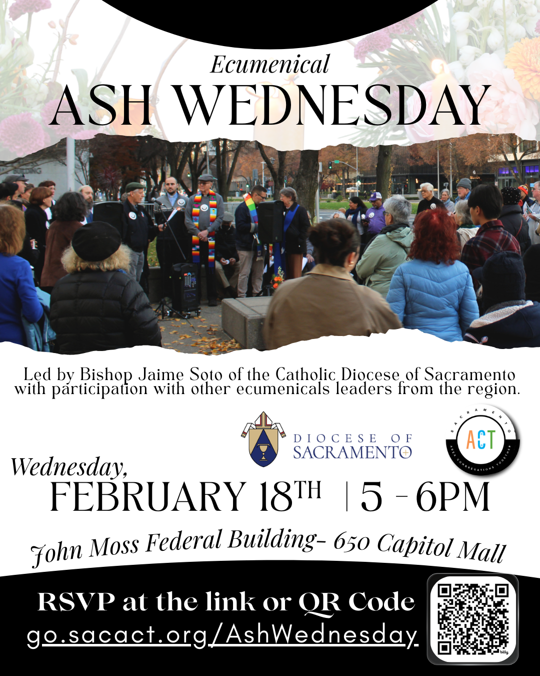 On February 18, join Bethany members and friends at the Ecumenical Prayer Vigil & Ash Wednesday Service happening outside the John Moss Federal Building, 650 Capitol Mall in downtown Sacramento at 5 p.m. Bishop Jaime Soto will lead the Ash Wednesday service. The event is sponsored by Sacramento Area Congregations Together(SacACT).