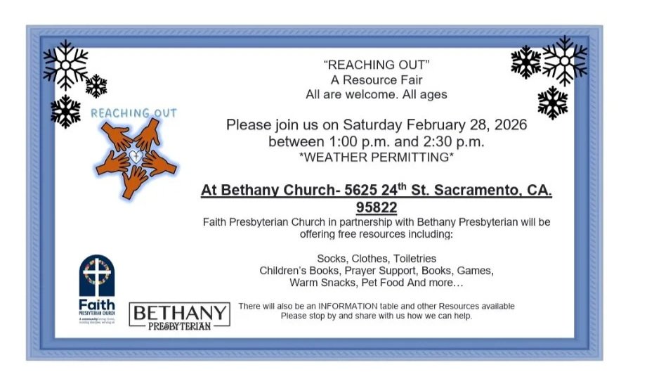 The monthly “Reaching Out” resource fair for those in our community who are in need takes place at Bethany 1-2:30 p.m. Saturday, February 28. This is sponsored by Faith Presbyterian Church with assistance from Bethany. Show up and report to Susan Just if you would like to be of help! There will be clothes, food, social service information, hot showers and other resources available.