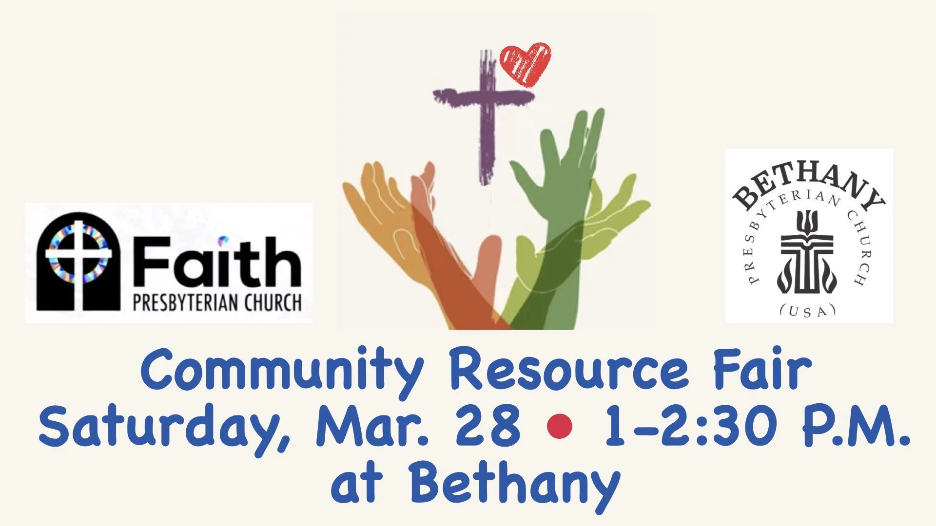 The monthly “Reaching Out” resource fair for those in our community who are in need takes place at Bethany 1-2:30 p.m. Saturday, March 28. This is sponsored by Faith Presbyterian Church with assistance from Bethany. Show up and report to Susan Just if you would like to be of help! There will be clothes, food, social service information, hot showers and other resources available.