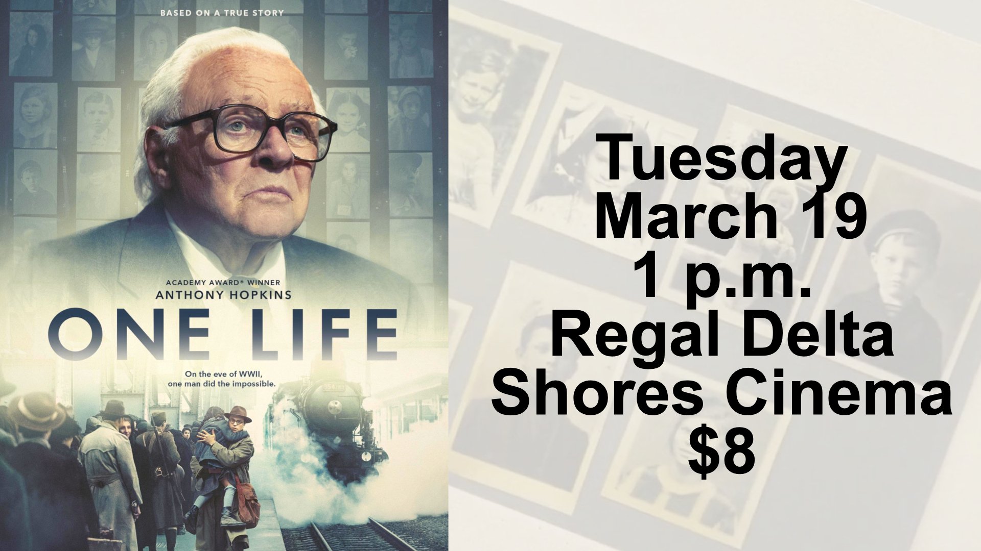Sir Nicholas “Nicky” Winton was a young London broker who, in the months leading up to World War II, rescued over 600 children from Nazi-threatened Czechoslovakia. Come and witness his inspiring story as we see the new film “One Life” starring Anthony Hopkins and Helena Bonham Carter. Join us Tuesday, March 19, at Regal Delta Shores Cinema, 8136 Delta Shores Circle. Click here for the location. Tickets are $8 each. Meet in the theater lobby at 1 p.m.; the movie starts at 1:10 p.m. The film is rated PG. There’s no need to RSVP; just show up. Several people are available to drive if you need transportation; just contact Cathy Sapunor.