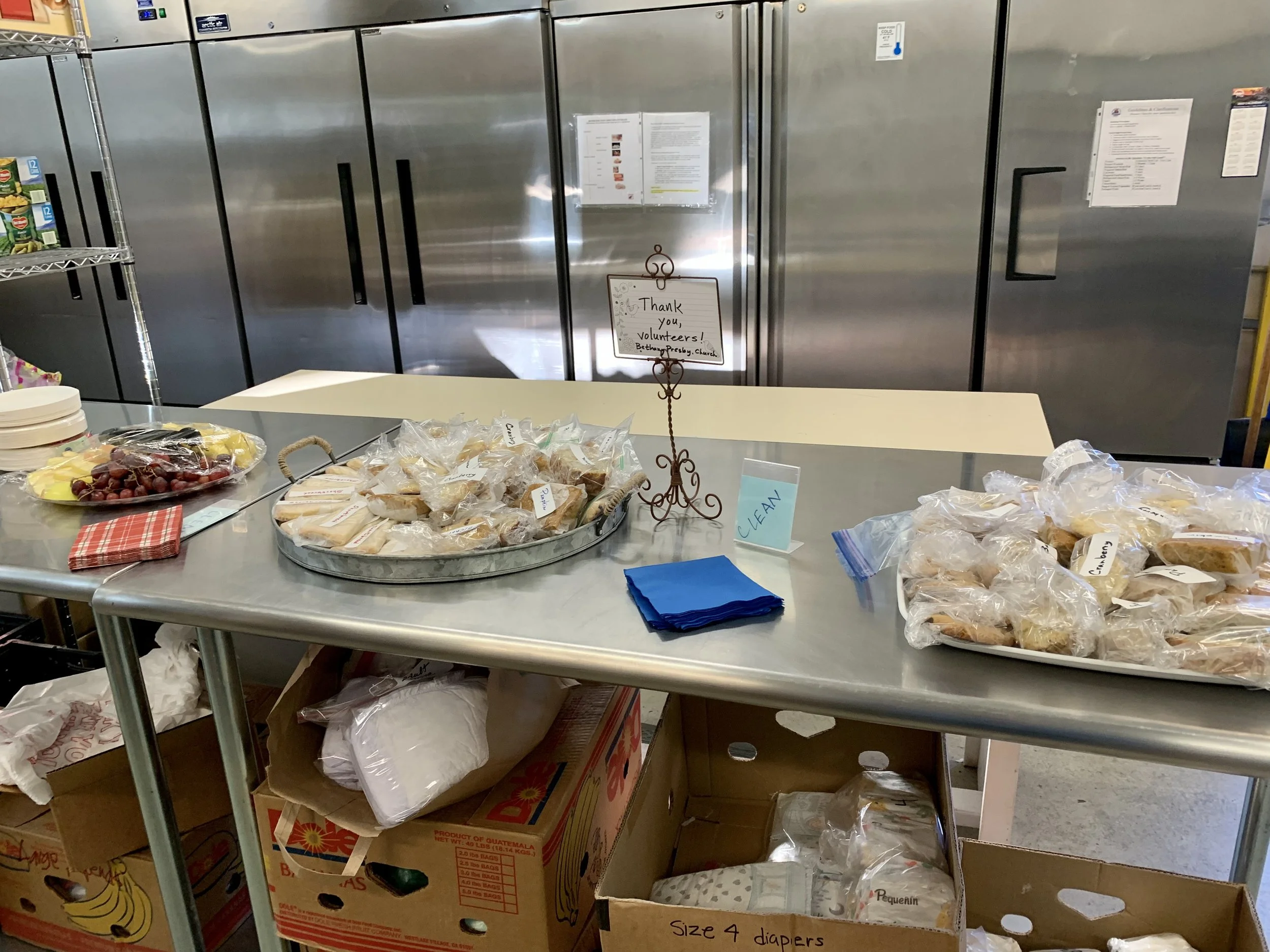Bethany’s Hot Cocoa Ministry returned in 2021, this year serving the dozens of volunteers staffing the SSIP Food Closet’s Thanksgiving grocery give-away day on Saturday, November 20. Several Bethany members and friends gathered the day before in the church. kitchen to prepare home-baked goodies. Five more joined the team Saturday morning to make coffee and serve the Food Closet volunteers.