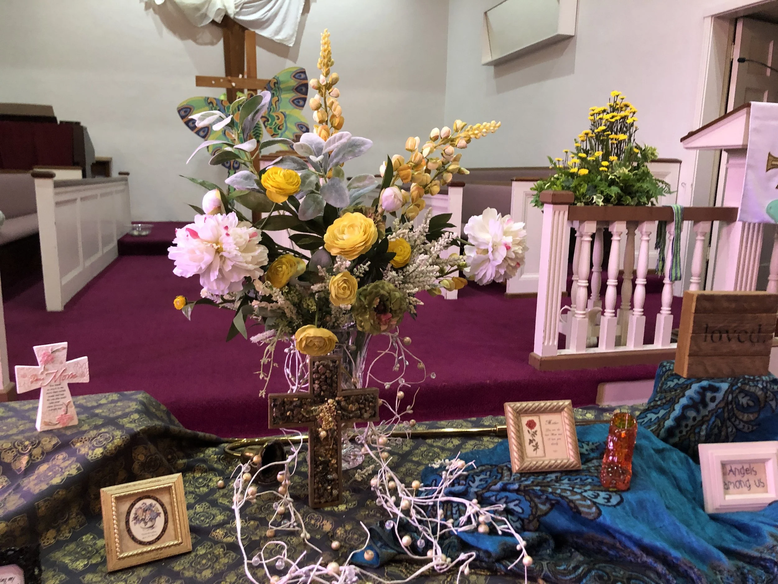 Today’s worship table featured decorations celebrating mothers. The large flower arrangements were the creations of Julie Nguyen of Bethany’s sister congregation, Grace Community Church.
