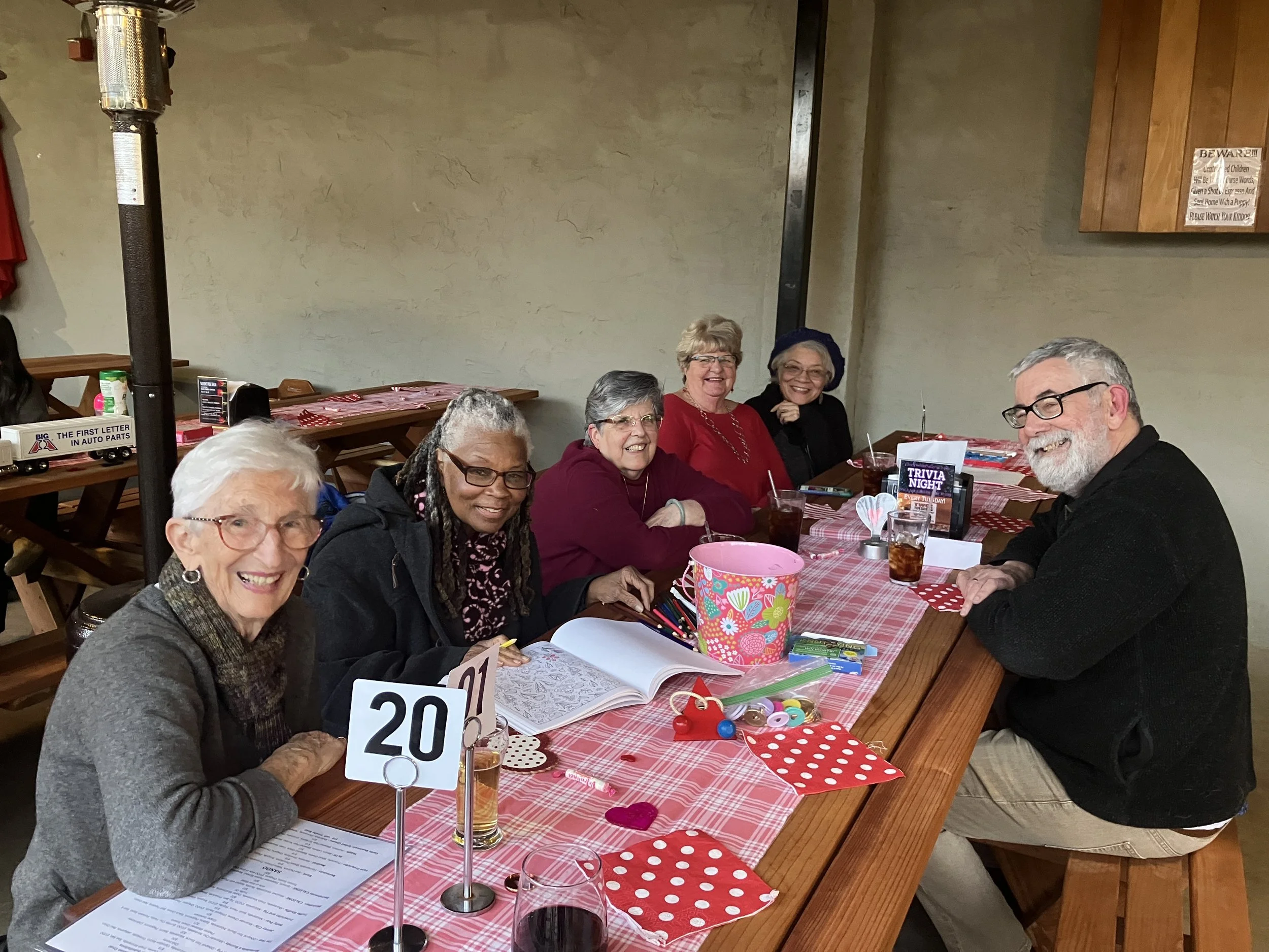 Twenty Bethany members and friends (ranging in age from infant to octogenarian) gathered at Hop Gardens Neighborhood Tap Room the evening of February 13 in observance of Palentine’s Day, a celebration of friendship. Stoked by pizza and beverages, everyone enjoyed lively conversation and table games (which is why you see a few fun mustaches in the pictures!)