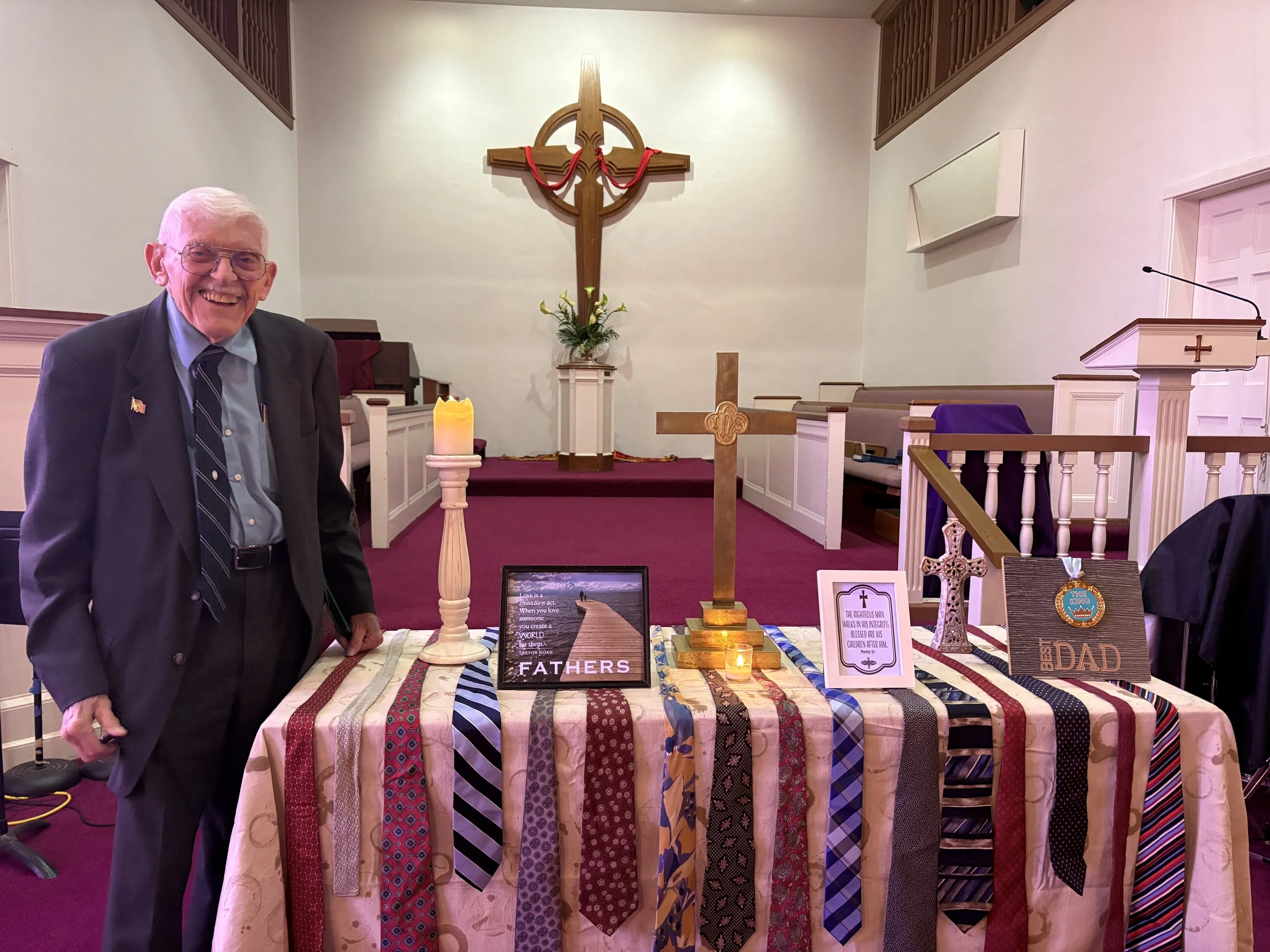 Howard McMackin, one of the most senior of Bethany’s fathers, posed with the specially decorated “Father’s Day” worship table.