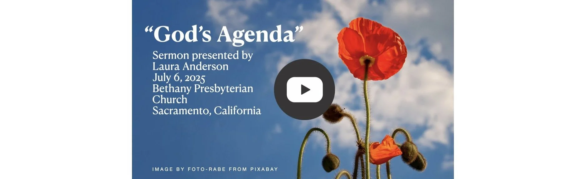 Laura Anderson led today’s worship service, preaching a sermon entitled “God’s Agenda.” Scripture readings were Galatians 6: 7-10 and 2 Kings 5:1-15.